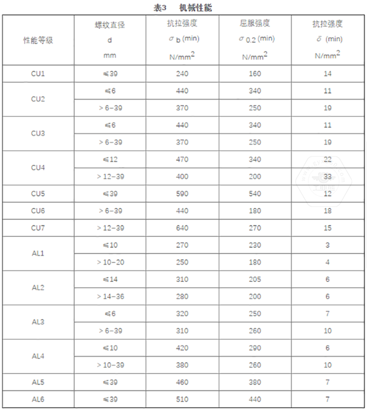 GB/T 3098.10標(biāo)準(zhǔn)中將銅制緊固件分為7個(gè)性能等級,標(biāo)記代號由字母及數(shù)字兩部分組成,即有色金屬化學(xué)元素字母加數(shù)字。其性能等級為CU1、CU2、CU3、CU4、CU5、CU6、CU7。標(biāo)準(zhǔn)中同時(shí)推薦了對應(yīng)性能等級選用的銅材料牌號。
