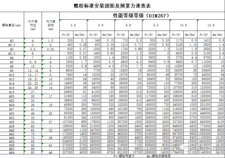 附螺栓標準安裝扭矩及預緊力速查表
